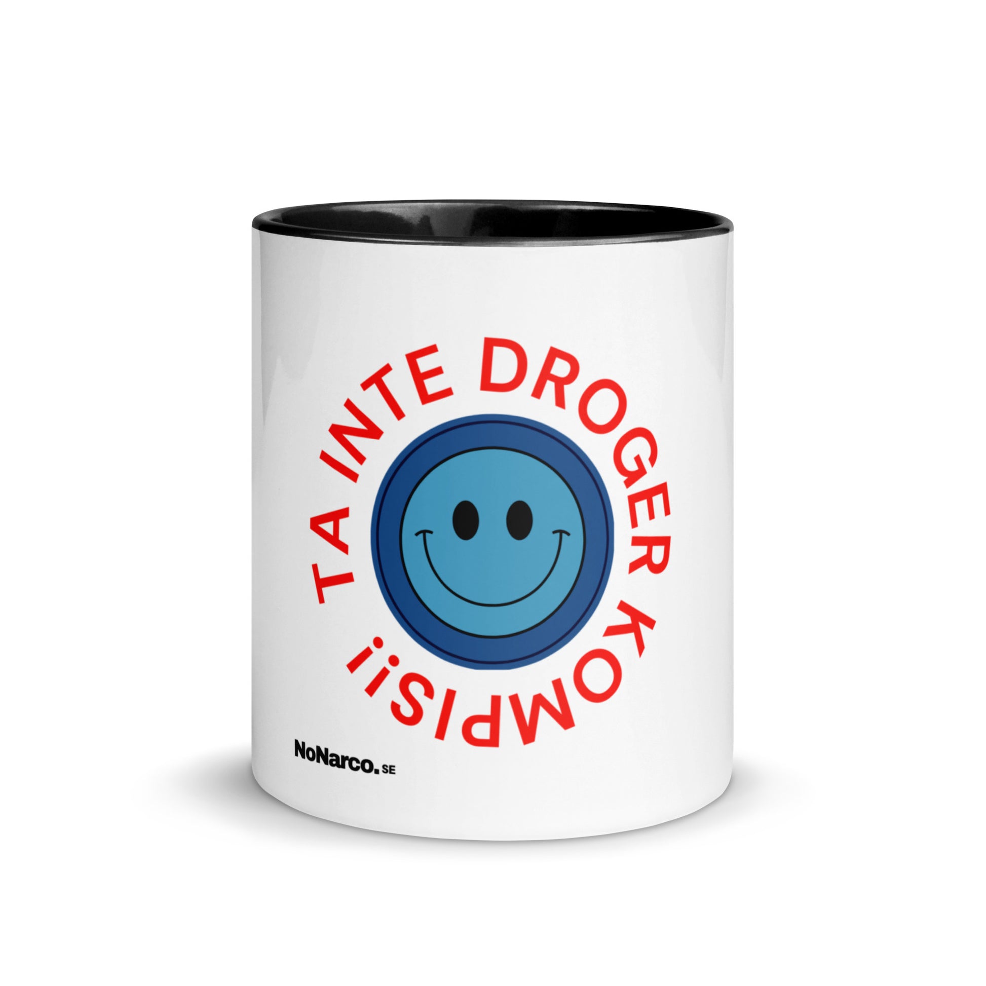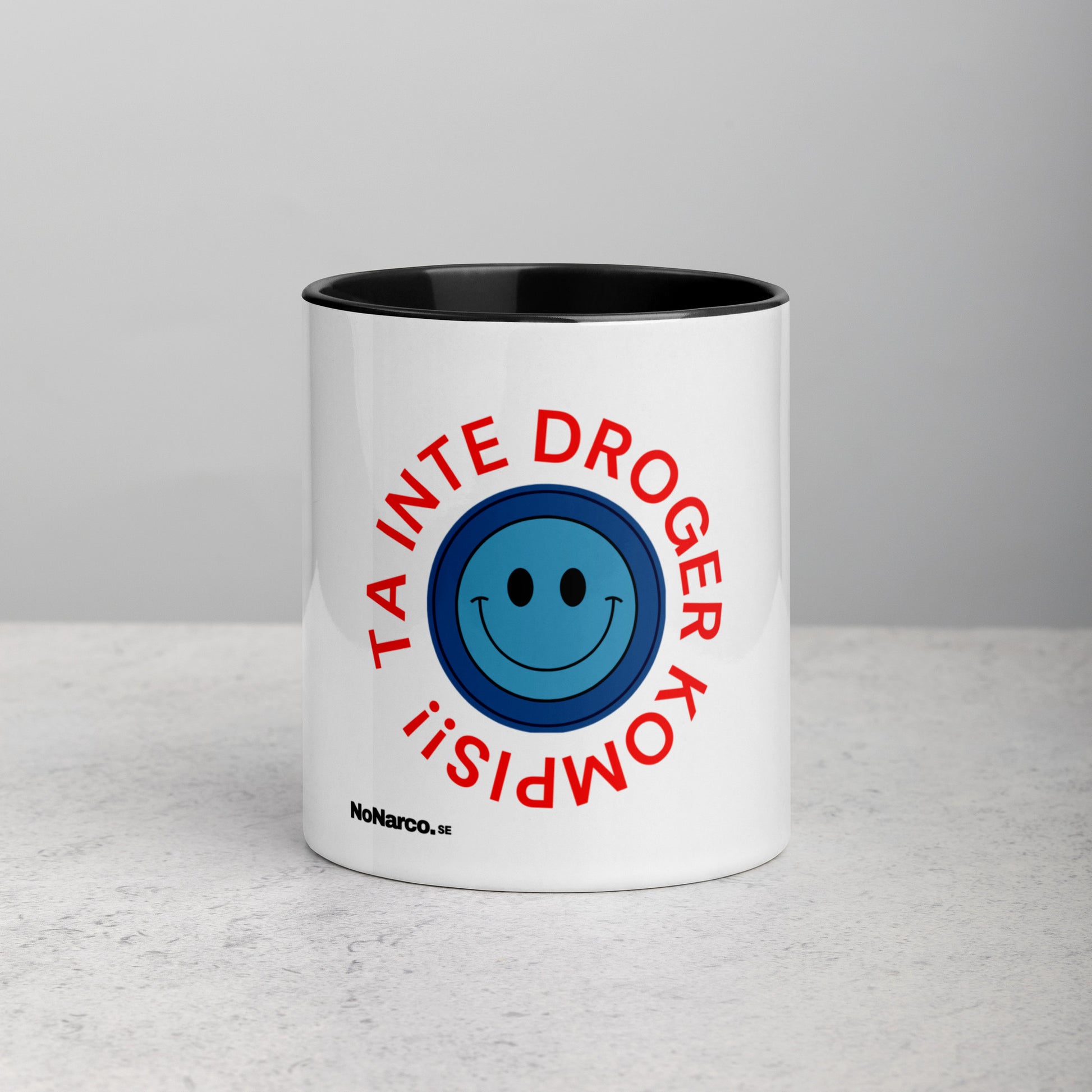 Denna mugg har ett tryck med texten "Ta inte droger kompis". Muggen har inte bara ett viktigt budskap utan också en snygg design.